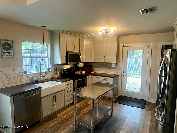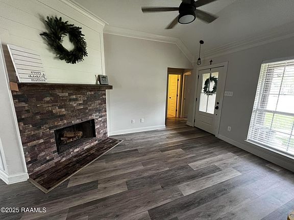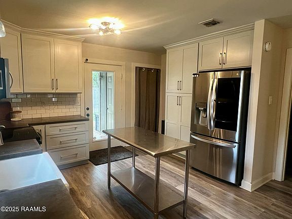 This charming home has been thoughtfully updated and is ready for its next owner! The interior was remodeled in 2019, with a new roof, rear fence, and full HVAC system (both interior and exterior replaced in 2023). Centrally located, this home is just minutes away from Pinhook, Youngsville Highway, Ambassador Caffery, and Kaliste Saloom. The open parking area comfortably accommodates two vehicles, with additional space available.Step inside to discover fresh, modern colors throughout. The covered porch leads to a bright and airy living area, featuring an exposed brick and shiplap wood-burning fireplace. The open floor plan seamlessly connects the living space to the dining and kitchen areas. The kitchen boasts custom soft-close cabinetry, a large farmhouse sink, concrete countertops, and stainless steel appliances.The spacious primary suite features high, trayed ceilings and flows into the primary bath, complete with quartz countertops, a large garden tub, and a generous walk-in closet. Two additional bedrooms with spacious closets and a full guest bath are located just off the living area.In addition, the property has recently undergone a full preventative termite retreatment in March 2024 by Don's Exterminating, (annual renewal completed again in March 2025) with a transferrable policy. Located in Flood Zone X.