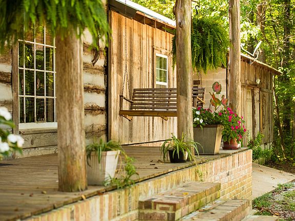 The centerpiece of the property is a cabin built from wood reclaimed from the 1800s, giving it a truly distinctive character. Inside, the cabin offers four bedrooms, one full bathroom, and one half bathroom. The kitchen provides a view of the front yard, and the dining area features a fireplace. A 2009 addition expanded the living room, creating extra space for gatherings. While the home has central heating, a wood-burning stove in the living room provides an alternative heat source.