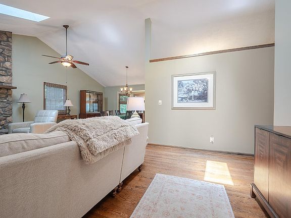Wow!! Incredible home offers a blend of modern updates, outdoor amenities, and community perks, making it an attractive find in Wildwood, Campbell County. Four bedrooms, three baths and open concept floor plan, hardwood floors. Plush landscaping and hardscaping including patio, outdoor fireplace, two sheds and lean to plus lake view from back yard. Walk in to open great room with vaulted ceiling, gas log fireplace, and bay window, dining room/area with bay window. Take the time to find all the features of this updated kitchen with roll out shelves, granite countertops, eating bar with French doors to sunroom having multi-split heating & cooling, custom blinds and windows overlooking lush back yard. Large Primary Suite with bay window, his and her closets and updated primary bath. Lower level with huge den area, foyer area with closets and access to back patio with retractable awnings, bedroom and extraordinary full bath. Laundry room with large stainless steel sink, oversized gar