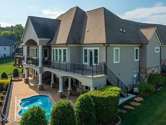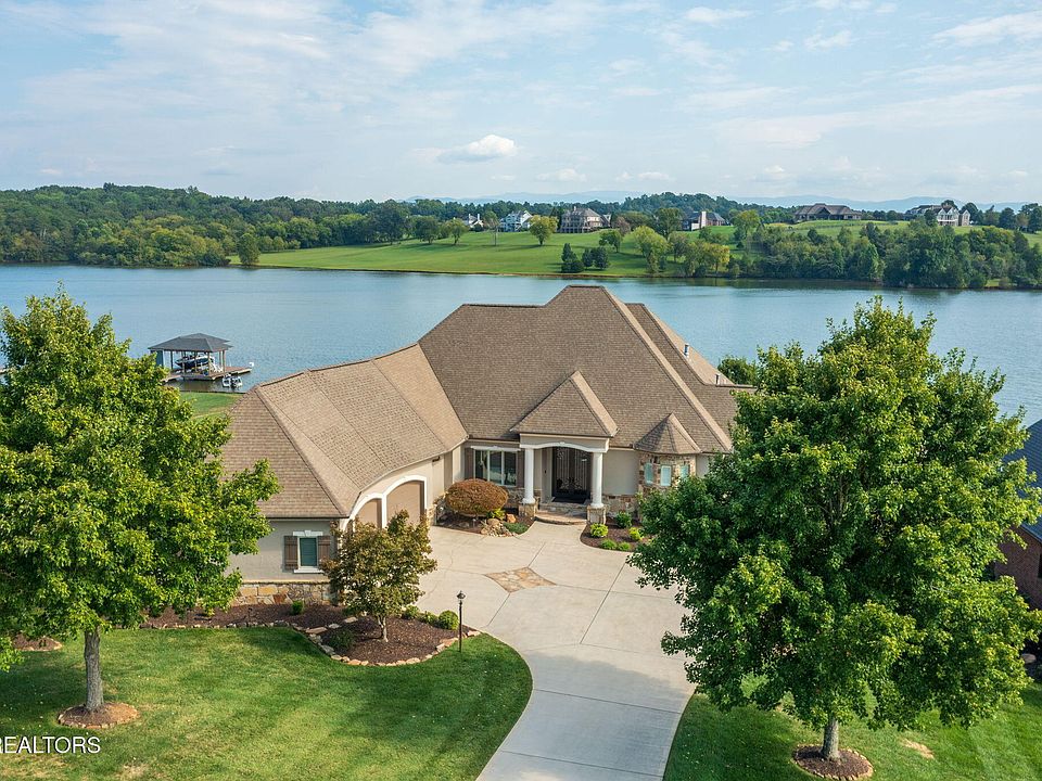 Enjoy one of the most breathtaking views on Tellico Lake with the Great Smoky Mountains as your backdrop. This beautifully updated home offers a heated saltwater pool with paver deck, covered patio, Trex deck, and a terraced walkway leading to a private dock with automatic boat cover and boat lift, two PWC lifts, and plenty of space to relax by the water. Inside, tall ceilings and expansive windows showcase the views the moment you step in. The 2022 updated custom kitchen features an oversized granite island, high-end stainless steel appliances, and a full wall porcelain brick backsplash. Hickory hardwood floors extend throughout the main level, which also includes a spacious guest suite that can serve as an additional primary suite. The owner's suite boasts lake views, tray ceiling, his-and-her closets, whirlpool tub, and a roomy walk-in tile shower. The lower level includes a built-in entertainment center with a 75'' TV with surround sound included, and a bar with GE Monogram refrigerator/ice maker. Additional features include a new tankless water heater (2023), plantation shutters, updated lighting, custom iron and glass entry door, irrigation system, and epoxy garage flooring. Located on a gently sloping 1/3+ acre lot in Tellico Village's Kahite community, you'll enjoy access to an 18-hole championship golf course, community pool, fitness center, tennis/pickleball courts, hiking trails, and community boat launch. This is lakefront living at its finest—move-in ready and waiting for you.