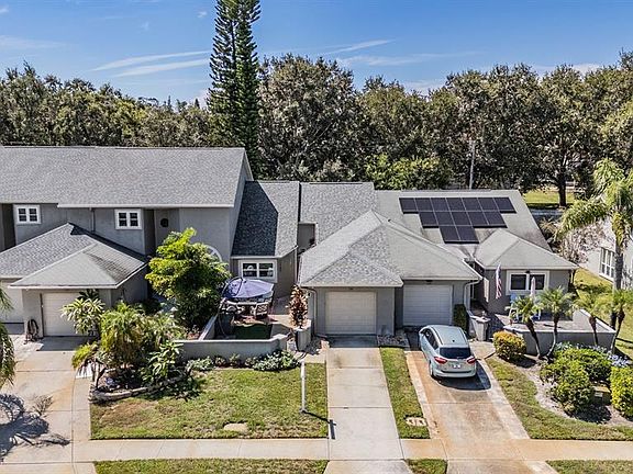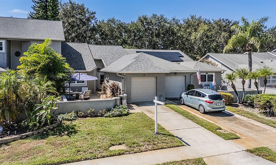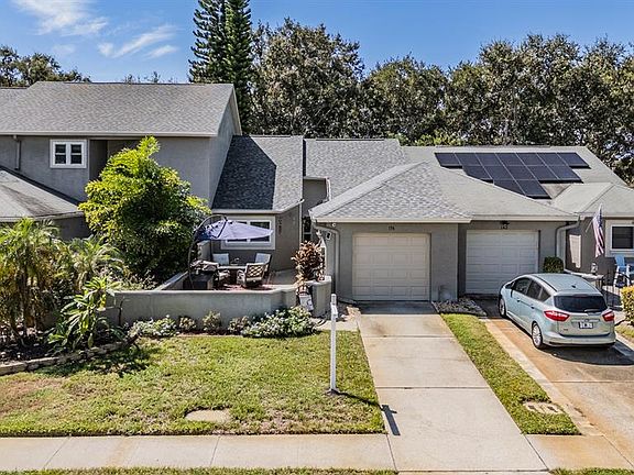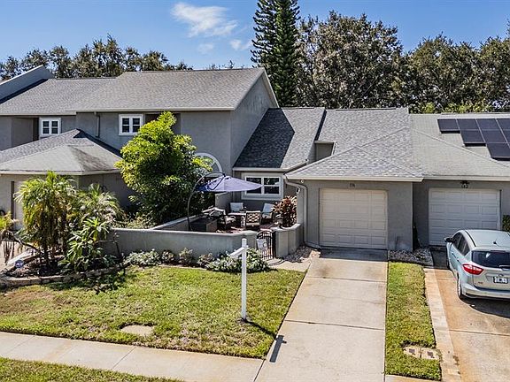 Beautiful Palm Harbor Villa with Community Pool & Tennis! This 2-bedroom, 2-bathroom villa offers just over 1,100 sq ft of comfortable living space. The open layout features ceramic tile flooring throughout and a warm kitchen with solid wood cabinets providing plenty of prep space. The master suite includes a private bathroom with a double vanity, a rainfall shower head, and a walk-in closet for easy organization. Step outside to the gated front patio area or enjoy the enclosed Florida room with direct backyard access. Hurricane-rated windows and doors, including garage door, were installed in 2025 (valued at $19,000) for added safety and efficiency. Major upgrades include a 2022 roof and a garage door opener replaced in 2025. The attached oversized 1-car garage adds storage and convenience. Windows have a transferrable manufacturer warranty. Community amenities include a sparkling pool and tennis courts. The affordable HOA covers internet, cable, lawn care, trash pickup, and exterior pest control. Located in desirable Palm Harbor just east of US-19, this villa is truly move-in ready and offers easy access to top-rated beaches, shopping, dining, and both Tampa International and St. Pete-Clearwater airports. Low-maintenance living in a prime location—don’t miss it!