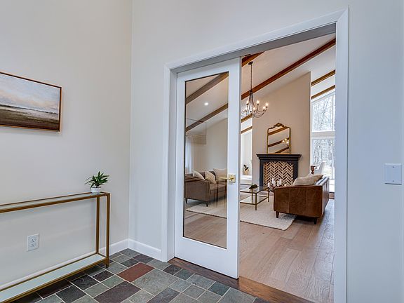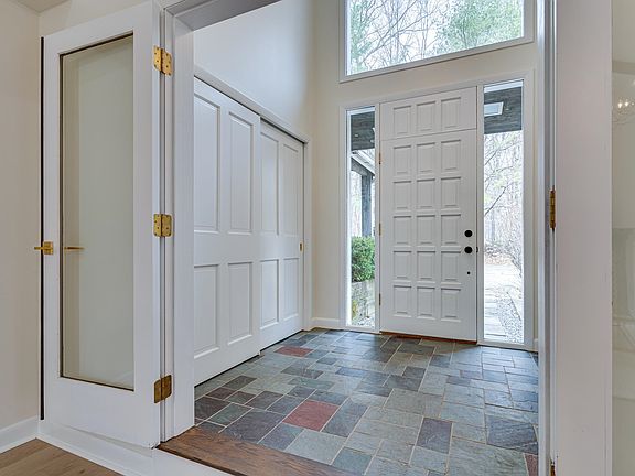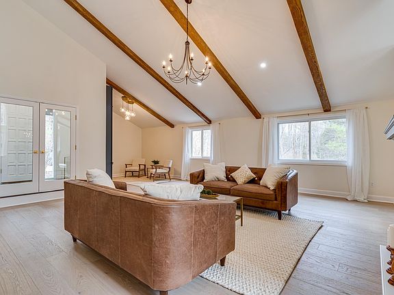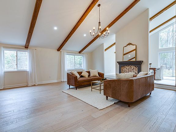 Nestled on a beautiful private 7.4-acre wooded lot you will find this delightful four-bedroom Contemporary style home that has recently been extensively remodeled. The main level features a huge living room with vaulted ceiling and a library alcove with floor to ceiling bookcase with ladder, a den or home office with glass French doors, a large sun-filled dining room leading to the fully applianced kitchen with generous eat-in area and pantry. A guest half bath, a fabulous mudroom with laundry and refrigerator, storage and a two story three-season sunroom complete the first floor. Upstairs you will find the spacious primary bedroom with dressing area complete with two bureaus and a private bath with double sinks, a soaking tub and separate shower and the second story of the three-season sunroom offering a great spot to enjoy your morning tea. There are three additional guest bedrooms and a full guest tiled bathroom with full tub/shower and double sinks. Recent improvements include all new kitchen and bathrooms, all new appliances, all new flooring, all new light fixtures, freshly painted rooms, new dining room slider, updated plumbing and electric, newer heating system with central air conditioning, new water filtration system, radiant heat in bathrooms and a huge 2 car garage with space for workbenches and room above that could be finished or just use for storage. There is plenty of outdoor space for entertaining and gardening. Delayed showings to start on April 20th.