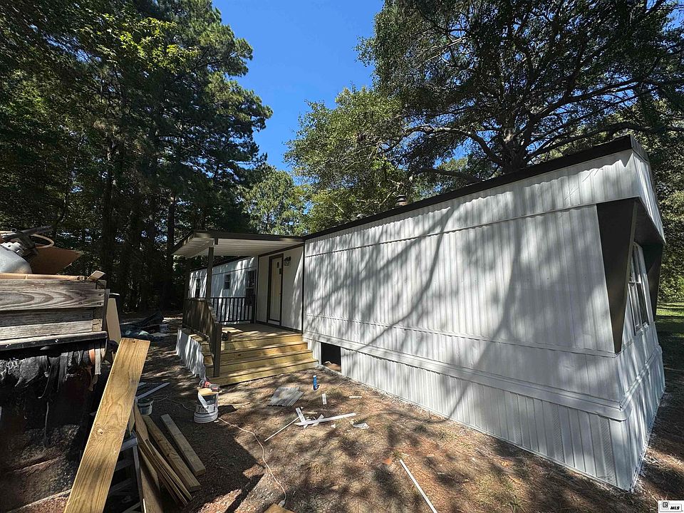 Charming single-wide mobile home in Simsboro sitting on almost an acre with a covered front porch, uncovered back porch, and a fenced backyard. Inside, you’ll find new flooring throughout and a spacious living room that opens to the kitchen. The kitchen features beautiful butcher block countertops and a walk-in pantry. The primary suite offers an en suite bath with a soaking tub, separate shower, and plenty of space to relax. Down the hall are two additional bedrooms, each with walk-in closets, and a remodeled bathroom showcasing subway tile to the ceiling above the tub. This property combines comfort, modern updates, and outdoor space—ready to welcome its new owners.