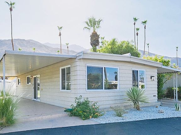 This refreshed 2-bedroom, 2-bath mobile home offers an open floor plan, abundant natural light, and a calm, Zen-like vibe the moment you step inside. Set on a spacious corner lot in the 55+ rent-controlled Sahara Park community, it features sweeping views of the San Jacinto Mountains.