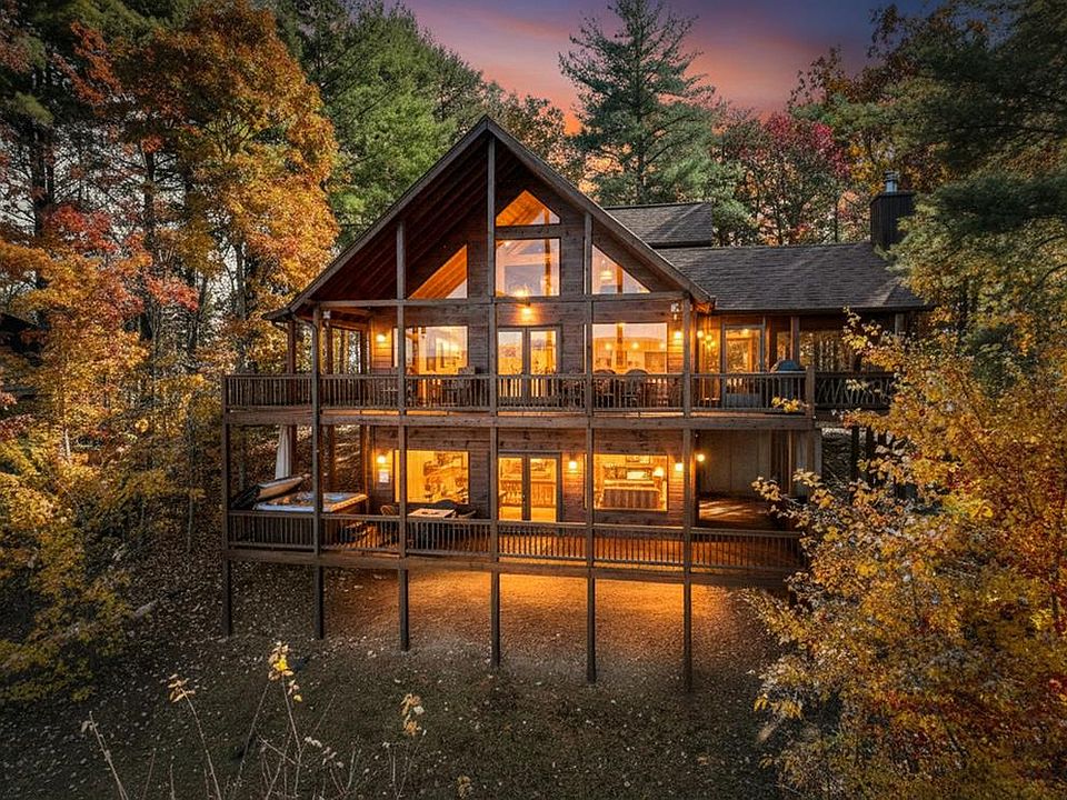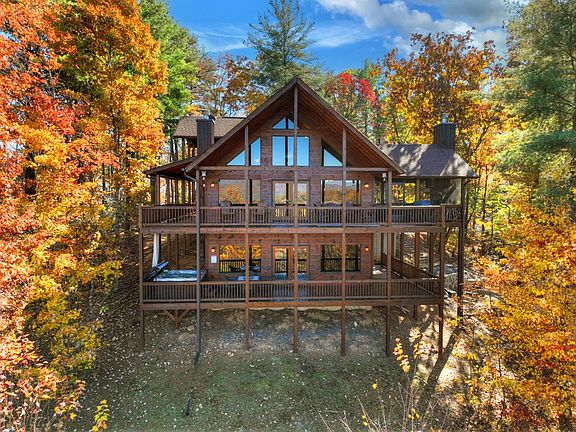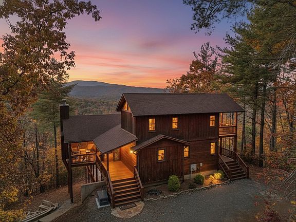Elevated Mountain Luxury with Unrivaled Cohutta Wilderness Views Perched at the pinnacle of The Oasis at Ritchie Creek, this exceptional mountain residence offers panoramic, long-range views of the Cohutta Wilderness and an elevated sense of privacy and tranquility. Designed with impeccable craftsmanship and thoughtful detail, the home blends refined rustic elegance with modern comforts—ideal as a full-time residence, private retreat, or turn-key luxury investment property with established rental history. The main level showcases an open, light-filled layout highlighted by cathedral ceilings, a striking wall of windows, and rich hardwood floors. A stacked-stone fireplace, granite countertops, and stainless steel appliances complement the gourmet-inspired kitchen and living spaces. The upper-level primary suite provides a serene escape, complete with double vanities, jetted soaking tub, separate shower, and a private balcony overlooking the sweeping mountain landscape. The terrace level is designed for relaxation and entertainment, featuring a guest bedroom and bath, a den with a wet bar, and access to the spa-level hot tub framed by unobstructed views. A screened-in outdoor living porch serves as an extension of the home, complete with a fireplace and generous space for dining, lounging, and year-round enjoyment. Located within minutes of premier hiking, trout waters, scenic train excursions, and the upscale dining and boutique shopping of Downtown Blue Ridge, this residence captures the best of refined mountain living.