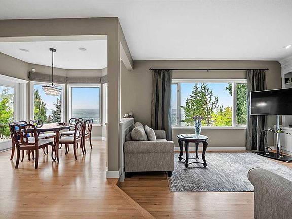 Welcome to 136 Patrick View SW—an executive walkout residence offering over 4,400 sq ft of refined living space, perched above a protected nature reserve in one of Patterson’s most prestigious enclaves. With 3,119 sq ft across the main and upper levels, plus an additional 1,300+ sq ft in the fully developed walkout basement, this home delivers luxury, functionality, and lasting value. From the moment you enter, a grand staircase and sunlit foyer set the tone for timeless sophistication. The main floor flows seamlessly through formal and casual living spaces, with newly refinished hardwood, luxury vinyl plank, and designer lighting. The professionally renovated kitchen features granite counters, a gas cooktop, and a built-in appliance wall with microwave above and oven below—anchored by a crystal-lit island and breakfast nook that opens to a topless glass rail deck framing panoramic river valley views. Upstairs, the primary suite is a sanctuary with heated marble floors, a freestanding soaker tub beneath a chandelier, and a walk-in closet with custom cabinetry and brass accents. The ensuite also includes a frameless glass shower with rainfall and handheld heads, and dual vanities with elegant lighting. Three additional bedrooms and a 5-piece bath offer comfort and flexibility for family or guests. A dedicated home office, a serene wellness room, and an elegant upper hallway with tray ceiling and chandelier add both function and flair. The walkout level is designed for leisure and entertaining, featuring a spacious rec room with fireplace, red-felt pool table, built-in bar with glass cabinetry and mini fridge, media lounge, and a cozy dining nook with bay windows. Additional guest bedrooms and a full bath complete the lower level, while large windows flood the space with natural light. Outside, enjoy a professionally landscaped yard with mature trees, a recessed fire pit area with stone surfacing, a private dog run, and a covered patio beneath the elevated deck. The property backs onto a nature reserve, offering unobstructed views and exceptional privacy. Aerial perspective reveals the home’s prime location—just minutes from top schools, boutique shopping, and downtown Calgary, yet surrounded by greenery and tranquility. Over $35,000 in recent upgrades—including new A/C, hot water tank (2025), washer/dryer, range hood, window treatments, garage painting, and refreshed landscaping—complement earlier renovations to the kitchen, ensuite, and deck. Every detail reflects pride of ownership and professional care. This is elevated living—crafted for those who expect more.
