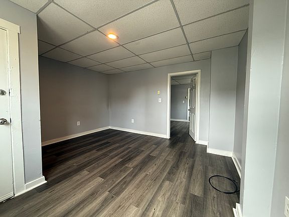 This renovated multi-level apartment features new gray wood-style flooring and light gray walls throughout. The living areas have large windows for natural light. The kitchen is updated with new white cabinets, a new stove and refrigerator, and a new sink with a granite-style countertop. The bathroom has a modern vanity, a toilet, and a combination bathtub/shower. The property is a multi-story building with white siding, and there are two large dumpsters and an attached fire escape visible outside. The owner is responsible for covering the costs of trash removal, water, and sewer services. The tenant is responsible for paying for heat, hot water, and electricity.