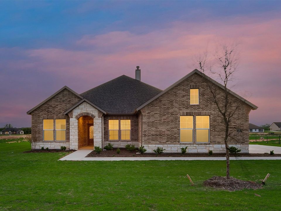 Upon entering the home off the front porch, you’re welcomed by an inviting foyer. Immediately to the left is a hallway with a bedroom, walk-in closet and full bathroom, as well as a linen closet. Across the foyer is a flex room, perfect for a home office, formal dining room or whatever need your family has for the space. Past the foyer is the family entry, with storage space and mud bench, which leads to the laundry room and two or three car attached garage. Through the entrance, the home opens up to a large family room with a stately fireplace. Adjacent to the family room is a gourmet kitchen, equipped with a walk-in pantry, ample counter space and an oversized island. Finishing off this open-concept living area is a dining space which overlooks the covered back patio.