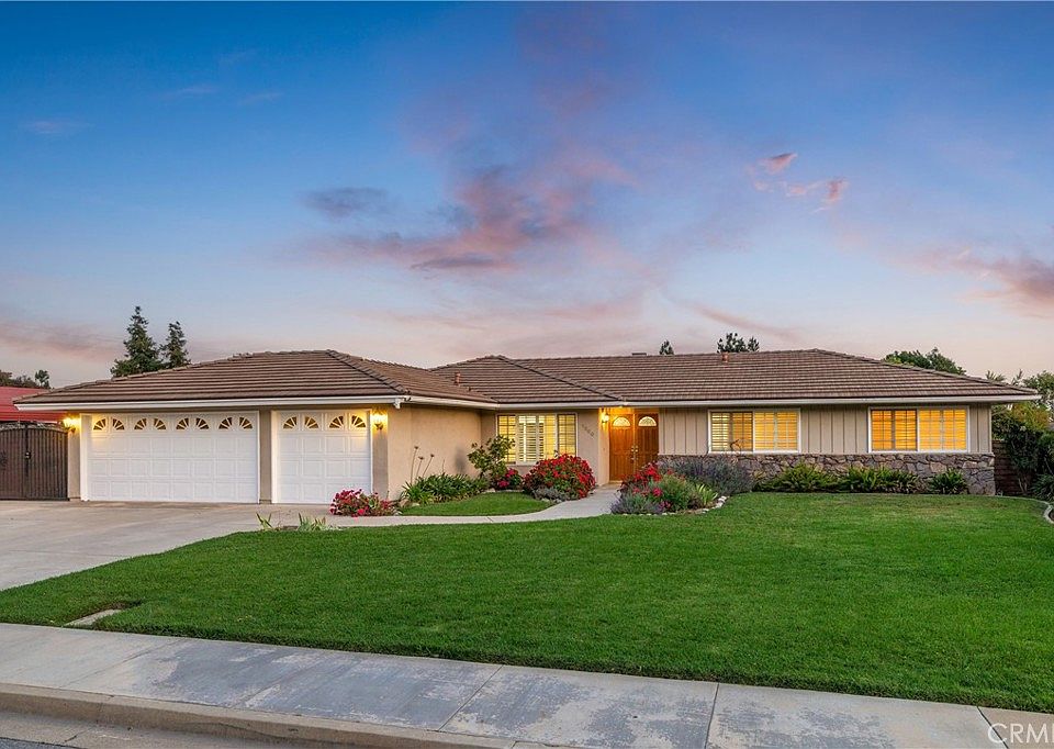 REMODELED SINGLE STORY POOL HOME. Situated on a large lot in a prime north La Verne locale, this home features beautiful front curb appeal with a large green lawn, planters, and a wide concrete driveway with a three car garage. A walkway leads to a covered front porch and double entry doors. A cozy entryway opens to the formal living and dining rooms. The living room features a fireplace with marble surround and a wood mantel, two windows overlooking the backyard, and brand new carpet. The adjacent formal dining room offers tiled floors and windows with plantation shutters overlooking the front yard. The great/family room offers a large sitting area with tiled floors and a sliding door to the backyard with plenty of recessed lighting. The open kitchen features custom cherrywood cabinetry, granite countertops and backsplash, stainless steel appliances, an island with pendant lighting, and overlooks the family room and pool to the backyard. Through the hallway the master bedroom offers new carpet, crown molding, a sliding door to the backyard, two mirrored closets, and an ensuite bathroom. The master bathroom offers a vanity with a granite countertop and a custom travertine shower. There are two additional bedrooms with new carpet and wood shutters on the windows. The hall bathroom also offers a vanity with a granite countertop and a shower/tub. The attached three car garage offers insulated garage doors, automatic openers, overhead storage, and laundry hook-ups. The backyard features a pool and spa with a spillway, grass areas, plenty of stamped concrete decking, a removable pool fence, lush landscaping, a side yard with a custom built shed, and a small RV parking area. All three sides of the yard have block walls. Walking distance to Oak Mesa Elementary school. Furniture and chandelier in dining room are digitally enhanced.