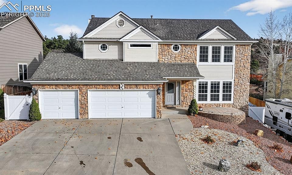 Welcome to this 5-bedroom, 4 bath home located in the sought-after Rockrimmon area! Nestled among mature trees and rolling hills, this property is one block away from Woodstone Park. Featuring a three-car garage, RV parking, central A/C and beautifully landscaped yards. Inside, you'll find numerous updates and upgrades throughout. The main level offers a formal living room and dining room with a well-appointed kitchen equipped complimented by solid countertops, ample cabinet space and a breakfast bar. Open to both dining nook and kitchen, the family room has a cozy wood burning fireplace and walk-out access to the back deck and yard. Master bedroom is a true oasis boasting a cozy electric fireplace, your own private deck and adjoins to a bath with double vanity, large walk-in shower and walk-in closet. On the lower level, there is another bedroom, a large family room, an additional full bath and a storage room. All of this and more located minutes away from hiking trails, open spaces, shopping and I -25 access.