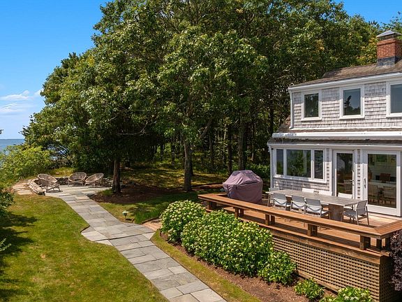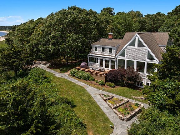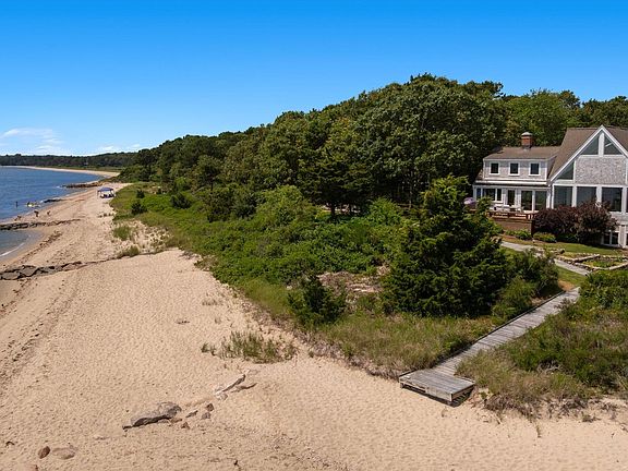 This extraordinary Cotuit beachfront home enjoys sweeping views of Sampsons Island and Nantucket Sound. Minutes from everything the village has to offer, the five-bedroom residence boasts an unrivaled location and lifestyle. Immediately upon entering, panoramic views take center stage, with walls of glass that frame the breathtaking surroundings. The open-concept kitchen, dining, and living areas cater to modern living, while a first-floor primary suite offers the utmost convenience. A seaside deck seamlessly blends indoor and outdoor spaces, perfectly designed for relaxing or al fresco entertaining, while a short path at the end of the lawn leads to one of Cape Cod's finest stretches of private beach. On the second level, four additional bedrooms make this home an ideal gathering place for family and friends. A finished lower level, currently outfitted as a home gym, offers flexibility for any need. Blending classic charm with a world-class waterfront setting, this is a rare opportunity to own a truly special piece of Cape Cod.
