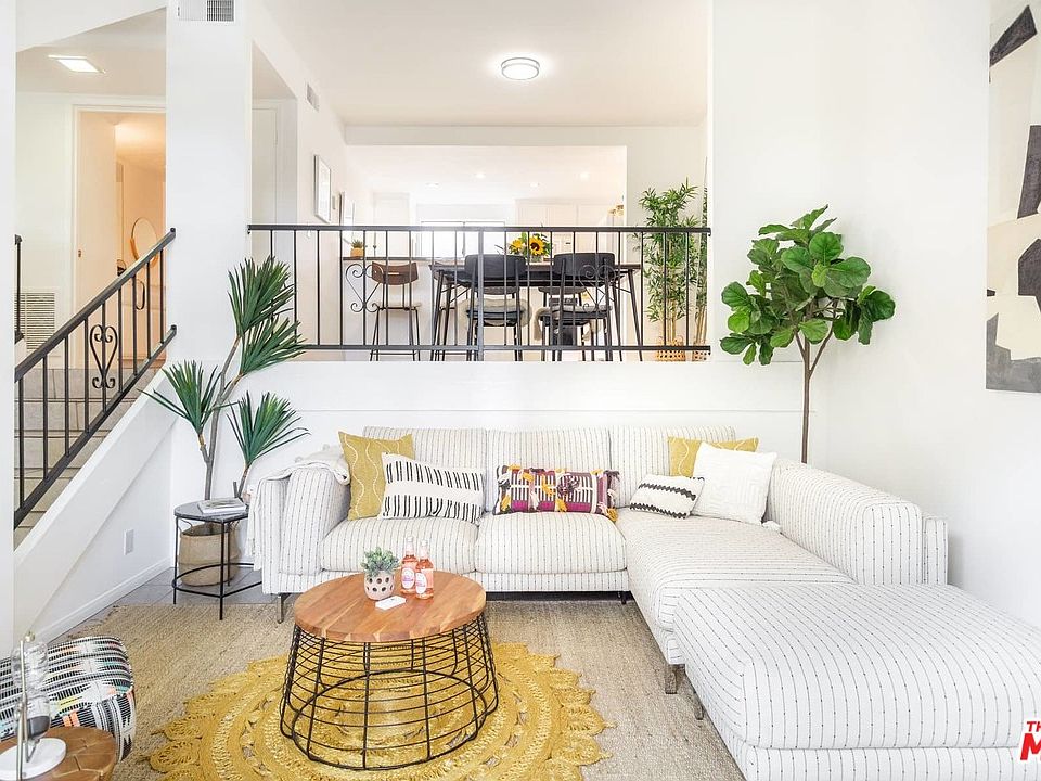Bright, light and airy! Here's your chance to purchase an architectural townhome with a wonderful floor plan. The open concept living area is perfect for entertaining family and friends. Soaring ceilings, suspended staircases, and a brick facade fireplace are real showstoppers. Enjoy views of tree tops from your serene living room or take in the afternoon on your oversized private patio. Powder room conveniently located on the main level is complete with in unit laundry! A large bonus room off of the kitchen may be used as a pantry or work from home office area. Upstairs you will find both bedrooms, extra storage and a remodeled bathroom. The private two car garage with direct entry really makes this property feel like home! Beautifully landscaped community with pool and spa is perfect for these hot summer days. Low HOA dues include basic cable, water, trash and landscaping.