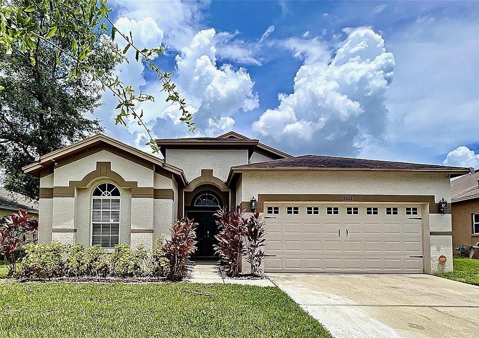 SELLER MOTIVATED BRING YOUR OFFERS! Charming 4-bedroom contemporary home located in the desirable South Fork community. The beautiful foyer leads into the open-concept floor plan. Notice the high ceilings and architectural details throughout the house. Spacious living and dining areas. Large kitchen with closet pantry, breakfast bar, 42" cabinets, and plenty of countertop space. The kitchen is open to the family room which is great for entertaining. Three-way split bedroom floor plan offering privacy and space for everyone. The Master bedroom is towards the back and is complete with a walk-in closet and spacious master bath with double sinks, a separate shower, and a garden tub. Two secondary bedrooms share an area with a hall bath. The 4th bedroom is on the opposite side of the house and is a perfect office or guest room. Well-equipped eat-in kitchen showcases matching appliances, a full breakfast bar, pantry, and tons of counter and cabinet space. The master bedroom offers a deep walk-in closet and en-suite bathroom including a tub, walk-in shower, and dual sinks. Screened lanai leading out to a fenced backyard that overlooks a pond and conservation area. Beautiful view and tranquil setting. The community has fantastic parks, pools, and recreational areas. No CDD fees!