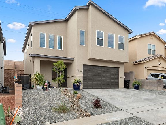 Experience modern elegance and quality craftsmanship in this stunning open-concept custom home featuring a soaring 20' entryway, quartz countertops, stainless appliances, raised panel doors, and an upstairs laundry for convenience. Energy efficiency shines with a tankless water heater, Carrier furnace, refrigerated air, and large low-E windows. Enjoy a fully landscaped front and back yard plus beautiful views. Conveniently located in North Four Hills, trails, Kirtland Airforce base, shopping, and dining at 10 minutes from uptown. With a 1/2/10 Builder's Warranty for lasting peace of mind.