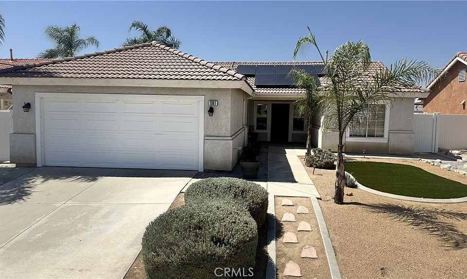 Ready to go. This 3 bedroom 2 bath home can be yours. Property has new carpet in Living room and Primary bedroom. This home has Tile roof, covered Aluma wood patio, Vinyl fencing. Primary Bedroom and bath on one side and 2 other bedroom and baths on opposite side of home Low -low maintenance with Artificial turf front and back with some drought resistant landscaping. Spacious Kitchen with gas oven and dishwasher. Indoor laundry room. 2 car garage with finished drywall. Close to shopping, minutes to downtown Redlands. Redlands School district and much more. Great location in middle of housing tract. -Buyer to assume solar lease of $119 per month currently. See it today. No HOA.