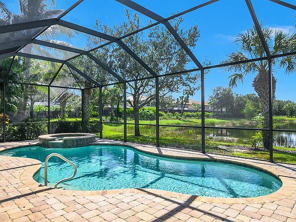An oasis in Estero! This beautifully designed 3 bedroom plus den, 2 bath home was a primary residence and has all the upgrades! Meticulously maintained, this home showcases an open floorplan in 1911 sq. ft. of living space with gorgeous hardwood floors throughout the living area, a salt-water swimming pool with jacuzzi and heater and a spacious screened lanai with a built-in TV overlooking a lake behind the property. Featuring an eat-in kitchen, granite counter tops, tray ceilings, dining room, laundry room and a 2 car garage. Master bedroom suite has a large walk-in closet, walk-in shower with a seat and his and hers sinks. Close to the front of the community, this home is walking distance from the clubhouse, tennis and pickle ball courts, community pool, fitness center and playground.