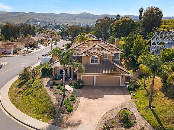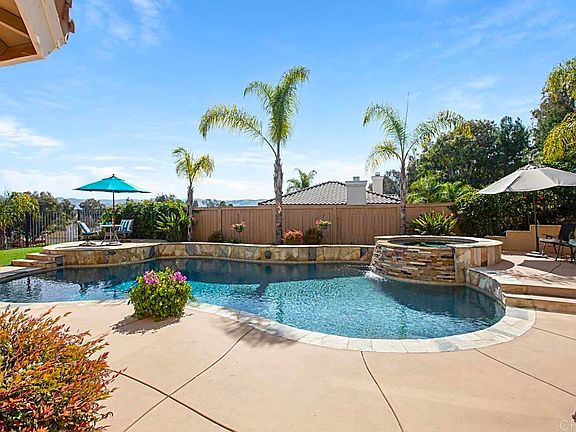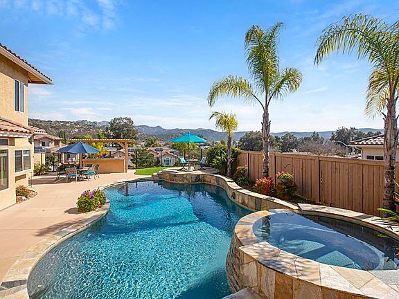 Nestled in a prime location, this exquisite home exudes an upscale charm, making it an entertainer's paradise for those who appreciate the finer things in life. Boasting a private, elevated corner lot with breathtaking views, this residence is a true gem in the prestigious award-winning Poway School District. Step inside this 4-bedroom, 3-bathroom haven spanning 2,674 square feet, where every detail exhibits pride of ownership. The allure of this home is evident as you are greeted by a stunning Pebble Tec Pool and oversize spa, alongside a covered outdoor kitchen with a BBQ and a long bar ideal for hosting unforgettable gatherings. From the moment you enter through the double front doors, you are welcomed by high ceilings and double arched windows that flood the space with natural light and gentle breezes. The grand living room with a cozy fireplace and large windows sets the tone for elegant living, while the adjoining dining room seamlessly connects the indoors with the outdoors through a slider and upper windows. The heart of the home lies in the bright eat-in kitchen, featuring warm Maple cabinetry, new Bosch appliances, a walk-in pantry, and recessed lighting—an inviting space to create culinary delights and lasting memories. The adjacent family room beckons with a second fireplace, wood flooring, and a new slider for easy access to the outdoor oasis. The main level also includes a spacious guest bedroom, a full bath, and a convenient laundry room with garage access. Ascend the wide, dramatic staircase to discover the oversized primary suite offering wall-to-wall windows that frame serene open views and gentle breezes. The luxurious primary bath is a sanctuary with a Travertine raised soaking tub, dual sinks, vanity, a walk-in closet, and ample storage space. Additional features of this exceptional home include a corner office with cathedral ceilings, an en-suite secondary bedroom with a full bath attached, a laundry chute, and a central vacuum system. Enjoy modern comfort with newer heating, air conditioning systems, pool equipment, and landscaping designed for low maintenance, including artificial turf, beautiful hardscape, and lush greenery. With no HOA or Mello Roos, this home is a rare find offering the perfect blend of elegance, comfort, and tranquility. Located in Poway with a thriving business community, low crime rate, excellent schools and close to freeways. It features art galleries, theaters and 55 miles of trails for hiking, biking and horseback riding. Don't miss the opportunity to make this exquisite property your own and create lasting memories.