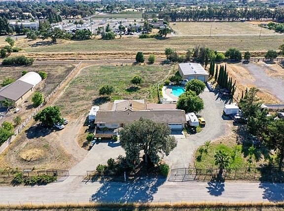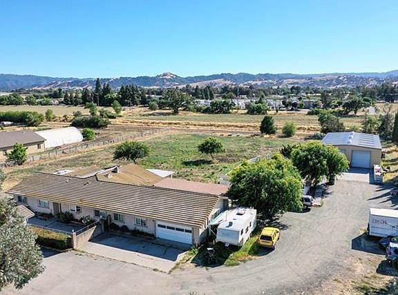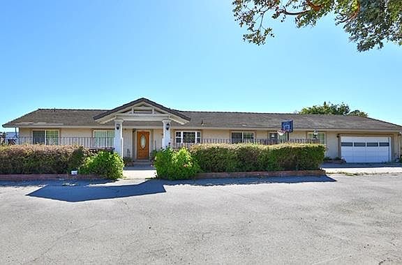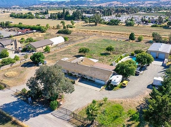Custom one story ranch style home on 2.5 flat usable acres. Gated entrance to spacious parcel with large parking area. Open floor plan with large living room and entertainment/rec. room., 4 bedrooms, 3 full baths, up graded kit., bathrooms,wet bar with stone floors and solar panels. Large master bedroom suite w/fireplace. 3000 sq. ft. steel building with roll up doors, perfect for many uses. Enjoy the pool in the backyard, the peace and quiet of the country within commuting distance to Silicon Valley. RV parking, room for vineyards, garden and stables..Buyer to assume existing solar contract. New pictures coming! Property to be sold As-Is.