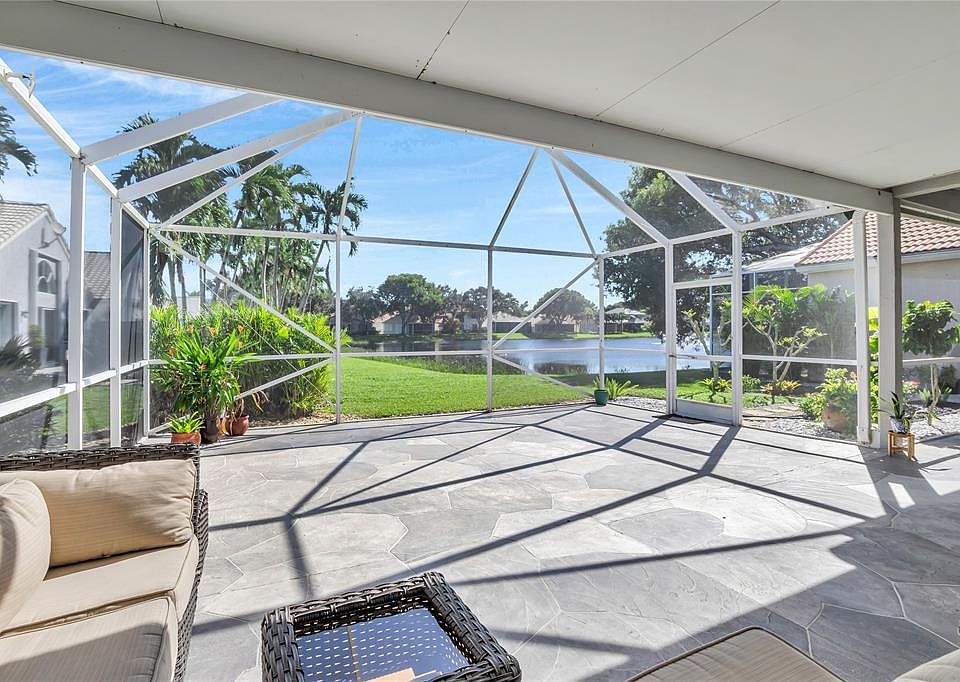 Welcome to POLO TRACE. Resort style living in a prime Delray location. Come see this open and airy 3 bedroom 2 bathroom home featuring a serene lake view with NEW ROOF, IMPACT WINDOWS AND DOORS throughout. The home has an expansive screened patio great for entertaining or relaxing in the morning or evening. This home is a must see at this price in a unique all-age community offering top amenities such as a bar and restaurant, tennis and pickleball courts, bocce, fitness classes, a gym, outdoor spa, lap pool, resort pool, a playground, kiddie pool and a 1.5 mile park like walking path without the country club equity membership. The HOA fee includes internet and cable, alarm, landscape and lawn care, pressure washing and exterior painting of your home. This is definite a must see!