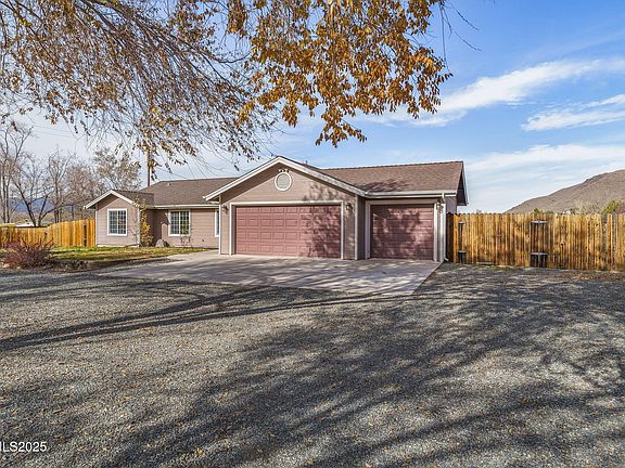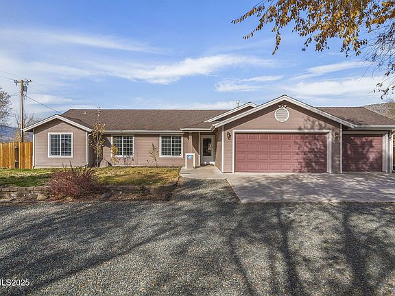Welcome to this spacious four-bedroom, two-bathroom home on a level, fully fenced acre in the desirable Johnson Lane area of Gardnerville. Offering both comfort and flexibility, this property is ideal for those seeking wide-open space, mountain views, and room to grow. Step inside to a bright, open-concept floor plan with vaulted ceilings and natural light filling the great room, dining area, and kitchen. The kitchen is designed for easy living and entertaining, complete with white cabinetry, stainless steel appliances, and a convenient breakfast bar. The adjacent dining area opens to the back patio through sliding doors, making indoor-outdoor living effortless. The primary suite showcases large windows with views of the surrounding hills, a generous walk-in closet, and an ensuite bath with dual sinks, a soaking tub, and a separate shower. Three additional bedrooms offer plenty of space for family, guests, or a dedicated office—each thoughtfully designed for comfort and functionality. Outside, the property offers endless possibilities. The backyard features a concrete patio with a custom pergola and plenty of space to relax, host gatherings, or enjoy the scenic mountain backdrop. The front and back yards are fully landscaped and fenced, with ample parking and a gated driveway leading to an attached three-car garage. The one-acre lot offers plenty of room to build an RV garage, workshop, or barn for horses, making this home ideal for those who love space and versatility. Located in the Johnson Lane community, this property provides the charm of rural living while being just minutes from schools, shopping, and outdoor recreation. Whether you're looking for a family home, hobby space, or your own slice of Nevada countryside, 1362 Johnson Lane delivers it all.
