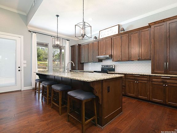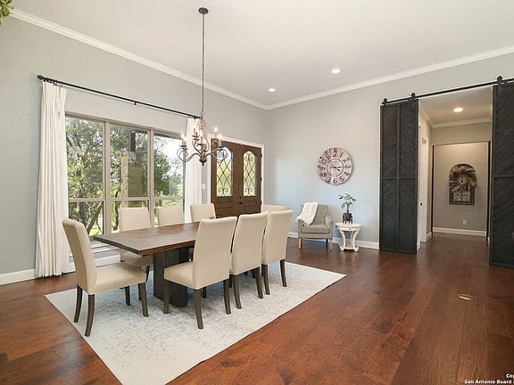 Assumable 4.375 VA loan! San Antonio luxury meets Hill Country charm in this immaculate custom home on 1.5 acres in gated Ridgeview Ranch. The stone & stucco exterior, standing seam roof, and private electric gate set the stage for elegance and privacy. Inside, hardwood floors, crown molding, and soaring ceilings frame an open layout with a dramatic floor-to-ceiling stone fireplace and walls of windows. The chef's kitchen features granite counters, custom cabinetry, subway tile backsplash, pendant lighting, breakfast bar seating, and a double butler's pantry. The downstairs primary suite offers patio access, tray ceiling, a spa bath with clawfoot tub, oversized tiled shower, dual vanities, and a walk-in closet with hidden safe. A private study with custom shelving doubles as a secondary guest suite, flex space, or gym downstairs. Upstairs includes 2 bedrooms, a full bath with dual sinks, and a spacious game room opening to a covered balcony with cedar beams and sweeping Hill Country views. Outdoor living includes a covered patio, hot tub pavilion, stone firepit lounge, and tiered gardens under mature oaks. Plenty of parking & storage with an attached side-entry 2-car garage, detached finished garage/workshop with plumbing & oversized covered carport. Fully fenced with professionally landscaping & irrigation. No city taxes, mins to Lackland AFB!