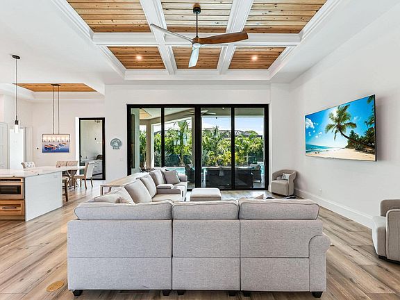 This one of a kind home sits in a prime location just one mile from the beach! New construction and fully custom built in 2025 includes 5 bedrooms, 4 bathrooms, expansive kitchen, 2 car garage, salt water pool with spa and sun shelf, and outdoor barbeque. As you walk through the 10 foot high front door you have the benefit of an open concept living space that perfectly blends a coastal and elegant feel. Master bedroom offers his and her closets and vanities, separate toilet room, expansive shower with dual shower heads with rain shower. The living room includes a custom built shiplap accent wall with television and electric fireplace. 10' sliders give sweeping views of the extensive lanai with multiple seating areas, outdoor shower and green space. The home is completely equipped with GE Cafe gas appliances drawing from the 500 gallon propane tank included on property. The custom finishes and detailed wood ceiling accents are the perfect example of artisanal craftsmanship. This home does not disappoint in any area and as a builder product, warranty is still in place. Fully or partially furnished it is ready for you to start your dream of island living today!