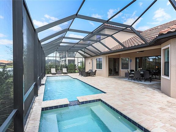 This Bridgewater Pool and Spa home is centrally located in the heart of Lakewood Ranch. The lanai, which overlooks a gorgeous lake that sparkles at morning's first Light, spaciously extends along the entire course of the backside of the home. Feathery prodocarpus with hues of light and dark green form a natural privacy wall on either side of the lanai, while large blooms of exotic hibiscus offer a visually stunning setting akin to the tropics. Built in 2016, the cleverly imagined "Cambridge Grande" embodies Masterful Design & Modern Luxury that exudes both comfort & convenience. The TRIPLE Glass Sliders in the rear of the Great Room offer a glimpse of the Outside Entertainment Area, which showcases that amazing Salt Water Pool & Spa. The brick pavered lanai also features a large under-roof seating area and provides an excellent opportunity to enjoy full sun or shade depending on your particular preference for that day. This home even features an electric roll down "storm catcher" that seals and protects your belongings in the under-roof lanai! As you take your first steps through the front door, you will immediately appreciate the beauty and openness of the interior living space, while the tray ceiling and crown molding add a flair of modern sophistication. The Kitchen Amazes, and includes Staggered 42 inch Cabinetry, gas cook-top, S/S Appliances, granite, & an adjoining Breakfast Nook. The great room, which feels and looks substantial, is a perfect spot for conversation, entertaining, or relaxation. The Spacious Owner's Retreat is cozy and comfortable and features a terrific en-suite bath too. The guest rooms are nestled in their own private wing and the den, which can double as a 4th bedroom, provides added versatility. So what's the "Cherry on Top?" Well, it's the bonus room, of course! The bonus room is styled as a great room and sports a wet bar and a refrigerator too! Maybe it's a movie room. Or perhaps another bedroom with an en-suite bath? This space is only limited by your imagination so create the vision and live spectacularly! Lakewood Ranch offers the Ultimate Florida lifestyle with resort-style amenities. Championship golf, tennis, pickleball, fitness, polo club, aquatic centers, and parks & trail...all within grasp! Bridgewater is a private gated community with easy accessibility to I-75, the UTC Mall, restaurants and much more!