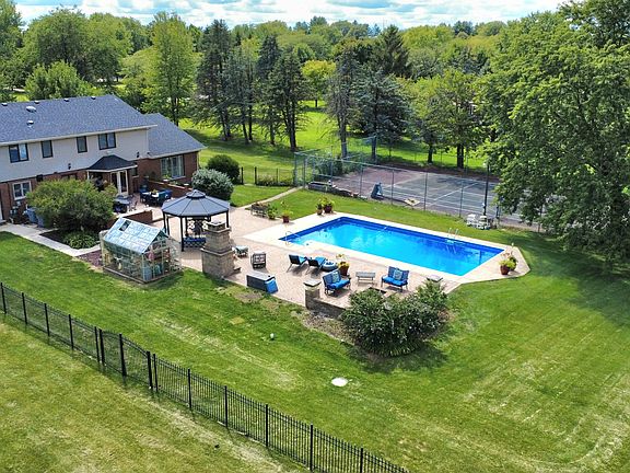 Fenced-in heated in-ground poolBrick fireplace with blowerFully finished basementWet-bar with beer fridgeSurround soundExercise roomPool table area