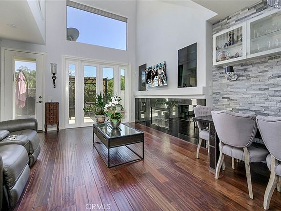 An Iconic Jewel Radiating Grace and Refinement! Through the front door awaits an inviting entryway that leads to the elegantly defined living room, where rich engineered wood flooring spans the space beneath a vaulted ceiling. Recessed LED lights and an architectural window infuse the room with warmth, highlighting a graceful fireplace adorned with a glass enclosure, marble tile facing, and beautifully crafted built-in cabinets with glass fronts. The cheerful dining area dazzles with its engineered wood flooring, stacked stone accent wall, sparkling crystal chandelier, wall sconces, and recessed lighting—an ideal setting for intimate soirées or cherished family gatherings. The well-appointed kitchen showcases timeless thermofoil cabinetry w/ laminate interiors, elegantly paired w/ gleaming quartz countertops & a porcelain tile backsplash. Stainless steel appliances—a microwave, gas range, dishwasher, and stainless steel sink—stand ready to inspire your culinary creations. Recessed & sconce lighting illuminate the space, inviting light to dance across every polished surface. The stylish powder room features a porcelain countertop, decorative granite wall accent, designer mirror, and dual sconce. The sumptuous primary suite offers a serene retreat adorned w/ engineered wood floors, a walk-in closet w/ custom shelves, additional wall-to-wall cabinets, recessed LED lights, a ceiling fan/light fixture, and faux wood blinds. The en suite bathroom beckons with a granite countertop, and upgraded mirrors. The porcelain-tiled shower stall features a mosaic tile floor, decorative glass border, & shampoo niche. Two versatile secondary bedrooms complete the upper level—each a peaceful haven featuring engineered wood flooring, mirrored closet doors, ceiling fan fixtures, & faux wood blinds. The remodeled Jack-and-Jill bathroom exudes sophistication w/ its porcelain tile floor, porcelain countertop & backsplash, upgraded light fixture, decorative mirror, & a soaking tub with matching surrounds. Beyond the French doors, a captivating garden oasis awaits—bathed in sunlight & surrounded by lush greenery, it offers the perfect setting for outdoor gatherings or moments of quiet contemplation. Nestled within the gated community of Hillsborough Collection featuring a pool, spa, basketball court & tot lot—residents can enjoy a lifestyle of leisure and distinction. This home is a true reflection of achievement, sophistication, and comfort—awaiting the next chapter of your story.