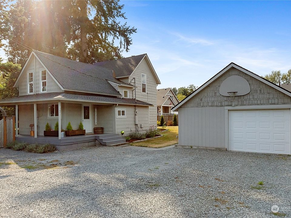 Adorable farmhouse has been thoughtfully remodeled with attention to detail and offers a blend of modern updates & vintage charm. Featuring a newer mini-split system for comfort during hot days and a wood-burning stove for cooler evenings. The kitchen boasts quartz countertops with undermount sink, high-end appliances including a Viking fridge and Bosch dishwasher. All appliances, including GE washer/dryer stay. Soft-close drawers and cabinets. Spacious, level lot with mature landscape, garden and recreation space. The garage/shop has potential for a mother-in-law suite or separate dwelling unit, with a 220 electrical panel and a room above garage with carpet & lights. Close to the Centennial Trail, Lk Stevens & Snohomish. Welcome Home!