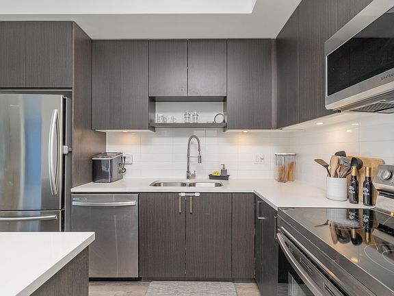 Welcome to Kings Landing 2 by Dawson + Sawyer! This stunning 2 bed, 2 bath + FLEX room boasts 9' ceilings and a functional living area with a contemporary feel. Kitchen is equipped with stainless steel appliances, a large kitchen island, white quartz countertops and undermount lighting. Primary bedroom has its own balcony and double vanity in the ensuite. 2nd bed is generously sized as is the flex space that would make a excellent home office (or other?). Building amenities include a bicycle room, gym, play area, board room, study room, club house with a full kitchen that opens to an outdoor patio with a community garden. Everything you need & a central location with Transit is at your doorstep, Close to Bear Creek Park, shopping, schools and more. Call today!