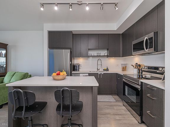 Contemporary feelStainless steel appliancesLarge kitchen islandWhite quartz countertopsOwn balconyExcellent home office