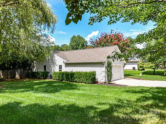 Welcome to this charming ranch in the sought-after Harvest Point neighborhood, perfectly positioned on a tree-lined, private corner lot with no HOA. This beautifully maintained 3-bedroom, 2-bath home offers easy, single-level living with a bright and spacious great room featuring vaulted ceilings, a cozy fireplace, and plenty of natural light. The kitchen boasts stainless steel appliances, generous countertop space, a pass-through to the dining area, and a sunny bay-window breakfast nook. Gorgeous hardwood floors flow through the main living areas, while bedrooms feature updated LVP. The primary suite includes a walk-in closet and an updated bath. Step outside to an expansive brick paver patio with multiple seating areas, perfect for entertaining or relaxing, plus a convenient, large storage building. The fenced backyard offers mature landscaping, lush grass, and great privacy. Conveniently located near shopping, dining, parks, and quick access to Hwy 115 and I-77.