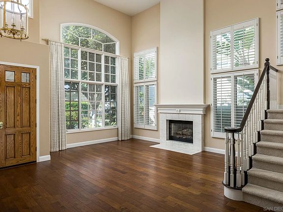Exquisitely updated Santa Fe Summit Plan 3 on a canyon-rim lot with sweeping views. Enter through double doors into a dramatic 2-story living room filled with natural light. Formal dining with tray ceiling and French doors flows to a redesigned chef’s kitchen with quartzite counters, custom backsplash, white cabinetry, center island, and bay window framing serene canyon views. Appliances include Sub-Zero, Dacor, GE, and Miele dishwasher. The family room features a striking floor-to-ceiling stone fireplace. 5 bedrooms plus bonus room, including entry-level ensuite. Primary suite offers vaulted ceilings, dual fireplace, and canyon views. Spa-like bath with heated floors, steam shower, soaking tub, Robern mirrors, bidet toilet, custom cabinetry, and dual-entry walk-in closet. Upgrades include dual-zone HVAC, two whole-house fans, LED lighting, hardwood flooring throughout, and 18 fully-paid solar panels on NEM 2.0. Spacious 3-car garage with overhead storage. Backyard is a tropical retreat with spa, firepit, built-in BBQ, grass play area, and palm-framed canyon views. Close to top-rated schools, trails, beaches, and Del Mar Highlands/El Paseo. Low HOA and Mello-Roos. Exquisitely updated Santa Fe Summit Plan 3 on a canyon-rim lot with sweeping views, this residence blends timeless elegance with thoughtful modern upgrades. Enter through double doors into a dramatic two-story living room, where soaring ceilings and expansive windows flood the space with natural light. A formal dining room with tray ceiling and French doors opens seamlessly for indoor/outdoor entertaining. The redesigned kitchen is a chef’s dream, featuring quartzite countertops with thick bullnose edge, custom tile backsplash, crisp white cabinetry, a large center island, and a bay window framing serene canyon views. Premium appliances include Sub-Zero, Dacor, GE, and a Miele dishwasher. Flowing directly from the kitchen, the inviting family room is anchored by a striking floor-to-ceiling stone fireplace—perfect for everyday living and gatherings alike. Upstairs, the primary suite is a true retreat, offering vaulted ceilings, a dual-sided fireplace, and breathtaking canyon vistas. The spa-inspired bath boasts heated floors, steam shower, soaking tub, Robern mirrors, bidet toilet, and custom cabinetry, all complemented by a dual-entry walk-in closet. Three additional bedrooms and a flexible bonus room (ideal as a media space, office, or possible 6th bedroom) complete the upper level. An entry-level ensuite bedroom ensures comfort for guests or multigenerational living. Upgrades include dual-zone HVAC, two whole-house fans, recessed LED lighting, and 18 fully-paid solar panels on NEM 2.0 for energy savings. Hardwood flooring extends throughout the home, with carpet fully replaced upstairs and in the downstairs bedroom, creating a cohesive and elevated look. A three-car garage with overhead storage adds convenience. The backyard is a private tropical oasis featuring a designer spa, firepit lounge, built-in BBQ, grass play area, and palm-framed canyon views—an idyllic setting for year-round California living. Ideally located near top-rated schools, hiking trails, beaches, and Del Mar Highlands & El Paseo shopping/dining. Low HOA and Mello-Roos complete this exceptional offering.