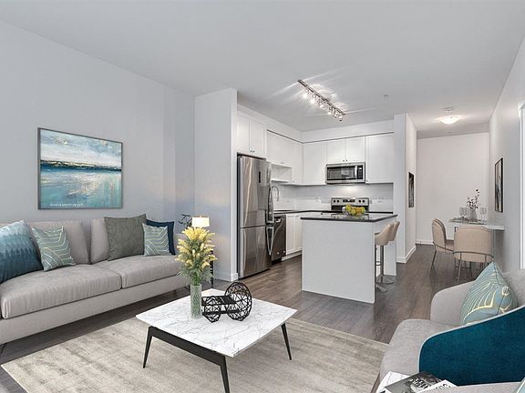 Corner unitContemporary open living spaceDurable laminate flooringLow-e windowsWhite shaker cabinetryDesigner stainless steel hardwareModern ceramic tile backsplash