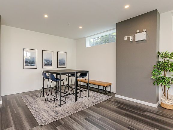 Contemporary open living spaceBright and open conceptDark shaker cabinetryQuartz countertopsDurable laminate flooringStainless steel appliances