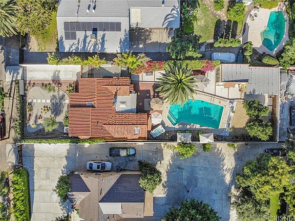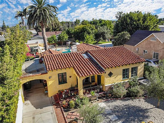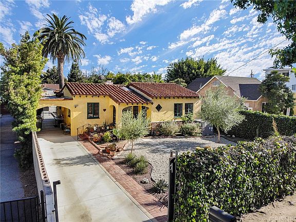 Traditional Spanish Hacienda with a Palm Springs resort-like atmosphere situated behind gates, offering privacy to this Hidden Paradise. Detached garage has been converted to a gym;studio area adjacent to a large storage bonus room with possible conversion into a ADU, Buyer to further investigate. The possibility for growth is endless. Front door entry leads you into a living room w/high vaulted beam ceiling w/skylight, original hardwood flooring, brick accented fireplace and an adjacent dining area with decorative 1930's textured ceiling. Remodeled kitchen w/Shaker style cabinets, granite counter tops, Stainless Steel appliances and tile flooring with plenty of storage including a pantry cabinet. Quaint Vintage 1/2 bathroom is adjacent to the laundry room with rear yard access. Natural skylight lighting accentuates the family room w/wood ceiling and glass slider doors overlooking the patio & stunning yard. Front bedroom offers alcove window w/sitting area, original casement wood windows, wood textured ceiling & modern w/w frosted glass closet doors. Partially updated hall bathroom has a nostalgic glimpse of the past with some modern touches of the present including a soaking tub, walk-in shower stall & a classic vanity with built-in sink. Rear bedroom features skylight, tile flooring, custom closet plus french doors leading to the spectacular yard w/gleaming swimming pool & spa, various gathering areas & low-drought landscaping for the feel of your own Oasis. WELCOME HOME!