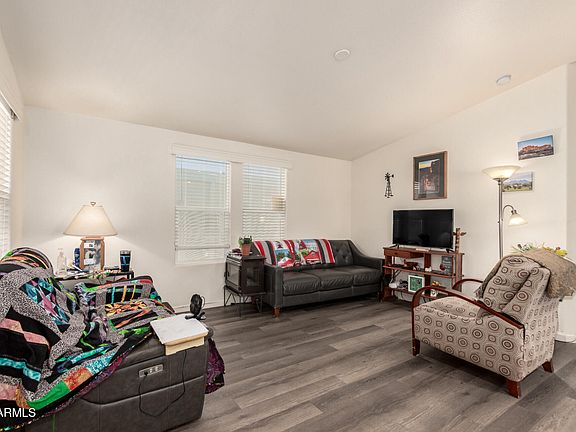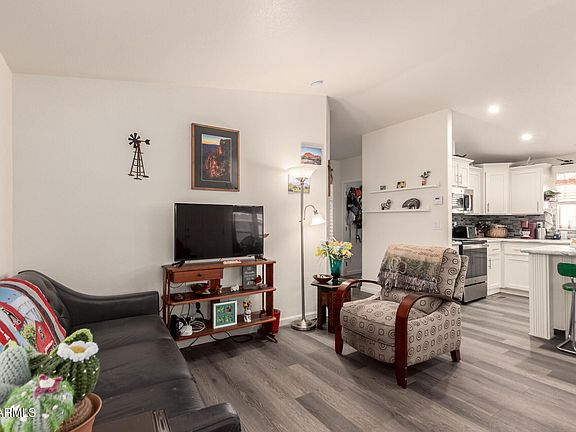 ADA accessibility for your convenience! Charming 2 bedroom 2023 CAVCO Sedona Ridge model in a quaint community with mountain views! This open-concept floor plan features a bright white kitchen with crown molding, marble-look countertops, backsplash, stainless steel appliances, and a large island with storage. Enjoy vaulted ceilings, no carpet, blinds throughout, and a spacious primary suite with walk-in closet. Covered carport, large enough for 2 vehicles and storage shed for your extras. Move-in ready and waiting for you!