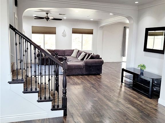 $65,000 Price Reduction!! Incredible opportunity to own a beautifully 6 bedroom, 3 bathroom home located near the top of the Lemon Grove Community in the City of Corona. As you step through the tall front door, you'll be welcomed by a stunning formal living and dining room area, adorned with wood flooring, crown molding, smooth finished ceilings, and a fresh coat of paint. The modern finishes flow seamlessly into a spacious family room that connects to a gorgeous kitchen, creating an open concept floor plan perfect for entertaining.