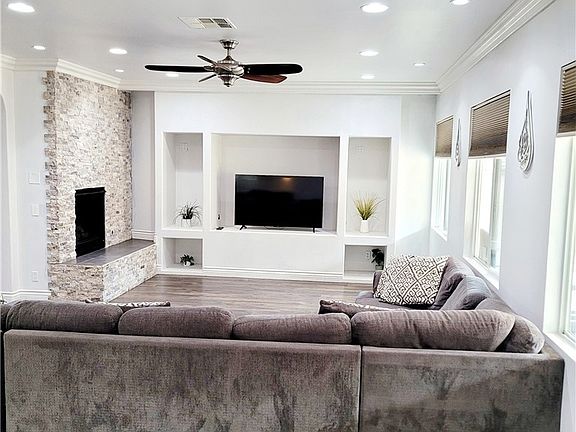 The kitchen features a large island, tile counter tops, and ample storage. The family room boasts a newly refinished brick fireplace and built-in entertainment shelving, equipped with wiring for most smart home automation systems.