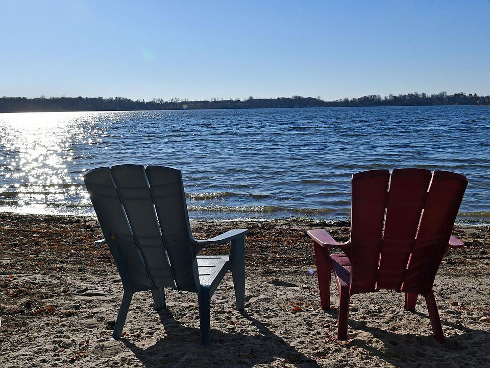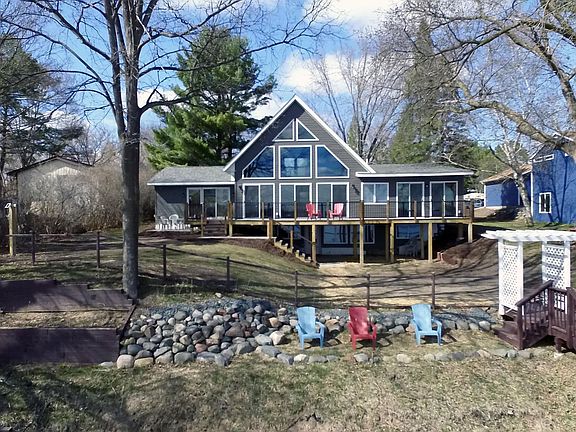 Lakefront home with 90’ of sandy lakeshore. Spectacular panoramic southern views from living, dining, bedroom, full length wrap around private deck, & the overlooks. Cozy lodge feel featuring one level living with loft. Gorgeous pine timber vaulted great room with stone & timber fireplace surround. Both bedrooms on the main flr have private baths. Primary bath features a jetted tub & walk-in shower. Main flr laundry & 1/2 bath. Walk-out level features a family room w/fireplace, kitchenette, 2 bdrms, 3/4 bath, & laundry with sink. Walk-out level was designed for multi-generational or short-term rental with a separate door from front entry to provide privacy for guests. Sloped bank redesigned with boulders, heavy duty staircase & pergola. New roof, siding, windows, air-exchanger, water softener & filtration, radon mitigation, drain tile, decks, insulation, plumbing, electrical, buried utilities, concrete pad & electric for future hot tub. Fabulous walkable Lindstrom location.