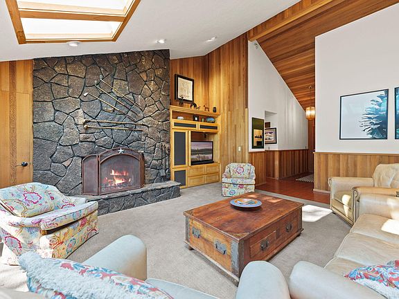 Wood-burning fireplaceDining areaHot tubUpdated bathroomsExpansive deckVaulted ceilingModern kitchen
