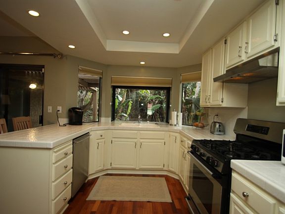Lovely 3 + 2 single story home located in a highly sought after neighborhood in Moorpark. This home is light and bright, has vaulted ceilings, neutral paint and beautiful wood-like laminate flooring throughout entire home. Kitchen includes huge garden window, stainless steel appliances, white tile counters and opens to Family room. Family room has wet bar area with sink and slider to backyard. Large step down Living room with natural stone fireplace and plantation shutters. Separate formal Dining room. Nice size Master Bedroom w/ 2 large mirrored closets and slider leads to backyard patio. Master Bath w/ Travertine flooring and double sinks. Secondary bedrooms have ceiling fans. Private backyard has covered stone patio surrounded by beautiful greenery. 2 car garage w/laundry.