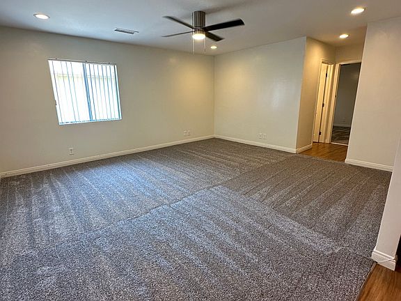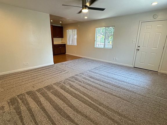 This is a nice 2 bedroom 1 bath family home with a 2 car garage, fenced yard with washer dryer hook up, freshly painted, new carpet, kitchen has a dishwasher, new stove, beautiful stained cabinets with lots of storage, new kitchen faucet, new faucet in bathroom, window treatments, can lighting in living room, hallway, kitchen and dining room, central air, enforced heating. We accept small dogs with approval!