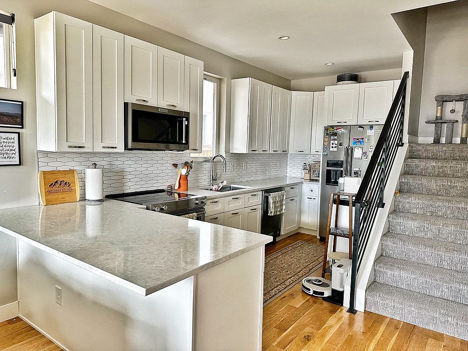 The open-concept floor plan features high ceilings, wood floors, and a sleek, modern design. Green features, including LED lighting and double-paned windows, make this home energy-efficient.