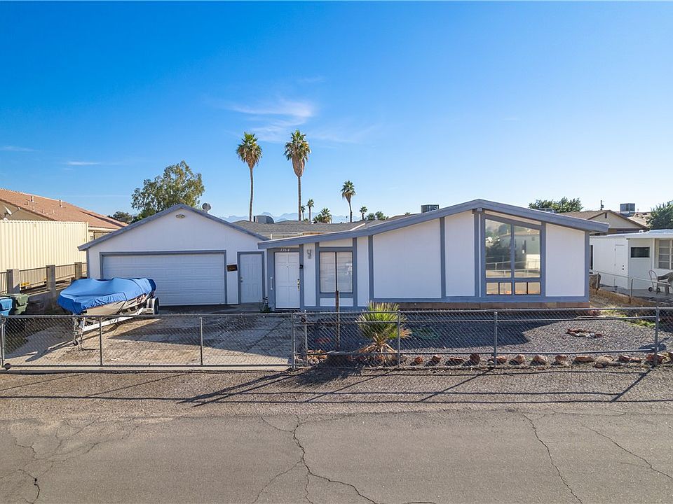 Situated in the Holiday Shores neighborhood, this double-wide manufactured home offers great potential with 2 conforming bedrooms, a versatile third non-conforming room that can serve as a den or office, and a permitted addition featuring an additional living room and a second bathroom. The property includes an attached 2-car garage, plenty of parking, and a locking front drive-through gate for added security and convenience. Just one block from the Colorado River and minutes from shopping, restaurants, and the Laughlin Strip, this home is perfectly positioned for both everyday living and weekend fun. Ready for your personal touch, with furnishings negotiable, it’s a fantastic opportunity to customize a home in a prime location.