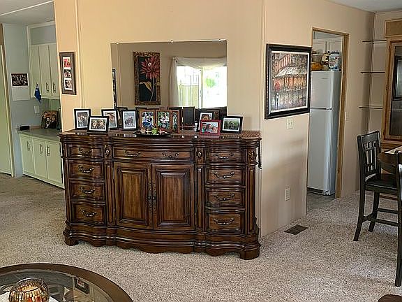 This lovely 2 bedroom, 2 bath, spacious home has newer renovated kitchen cabinets and countertops and has plenty of cabinet space. 2 full baths, and a beautiful garden style tub, tiled counter. Lots of closet space. Carpet is newer and in excellent condition. Interior and exterior of home is well-maintained and kept up. Outdoor large shed with shelving. A very secluded backyard with new patio addition and landscaping. The house backs up to a running creek which is very relaxing to hear, which boost of lots of mature trees to give shade and privacy. Roof is in excellent shape and has been well maintained and currently still under warranty. Newer covered deck with plenty a room to entertain friends and family. Yard has been designed for low maintenance and has a beautiful muraled fence. The park is a 55 and older, very clean, very quiet and has a beautiful well-maintained seasonal pool.