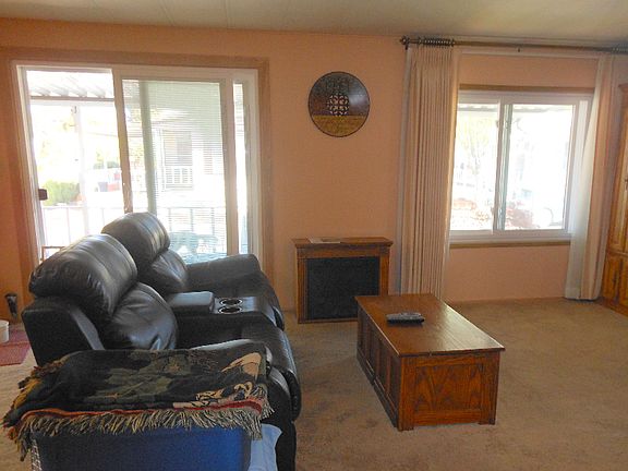 Here's to a New Home, New Adventure, New Memories! This 3-bedroom, 2-bathroom home features new vinyl double-paned windows providing great light in the open floorplan--plenty of room for entertaining or finally getting to all those projects that need space. This home provides 2 large living areas connected through the dining area and the kitchen. The sliding glass doors bring the outside in, leading to a large, covered porch-overflow for guests or your own little get away with coffee and a good book in any weather. The kitchen affords space for more than one cooking project at the same time! The kitchen island gives you extra counter and cupboard space with room for bar stools. The contemporary stainless steel kitchen ceiling range hood tops off the space. Large pantry cupboards surround the double wall oven. All appliances are included: washer, dryer, stove, double wall oven, refrigerator, dishwasher and new heat pump with central AC. The main bedroom has a large ensuite bathroom. The owners started to remove the oval tub to accommodate a large shower-they will leave the materials to complete this project. The sizable guest rooms are ready for family and friends. The fenced yard is low maintenance yet has plenty of room for a garden. Covered parking is comfortable for 2+ vehicles. Not just one, but 2 sheds for extra storage. This lovely park provides pool, clubhouse, library, billiard room, boat/RV storage and planned activities. This one will be scooped up quickly-don't miss out!