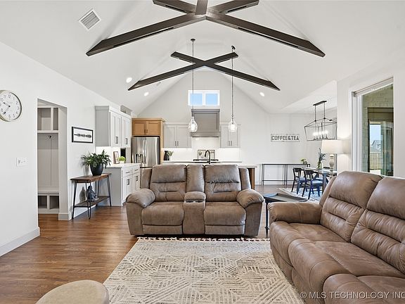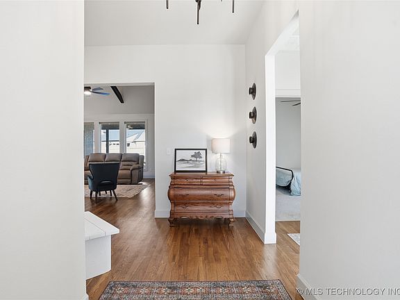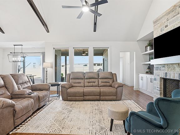 MOVE-IN READY newer construction home on a cul-de-sac in Bixby’s popular Torrey Lakes community, just one mile from Bixby West schools! This single-story home features an open concept design with luxury wood flooring, vaulted ceilings with scissor-truss beams, and abundant natural light. A stone gas-log fireplace with built-ins creates a warm focal point in the living area. The chef’s kitchen offers marbled stone countertops, a gas range, under-cabinet lighting and outlets, a granite composite undermount sink, and a walk-in pantry with excellent storage. The garage entry drop zone adds convenience and organization. The private primary suite includes a spa-style bathroom with double sinks, extended counter space, a freestanding soaking tub, a tiled shower, and a private water closet. The large primary closet connects directly to the laundry room for easy functionality. A full hall bath also features double sinks and an under-lit vanity. Step outside to a larger-than-most backyard — one of the bigger lots in the neighborhood — offering great space for pets, playsets, gardens, and future outdoor living plans. Covered patio access from both the dining nook and primary suite enhances your indoor-outdoor lifestyle. Attached 3-car garage provides ample parking and storage. Torrey Lakes is known for its family-friendly amenities including a neighborhood pool, park, pond, sidewalks, and beautifully landscaped entrances, all near shopping, dining, and Bixby’s top-rated schools.