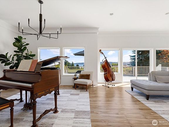 Stunning estate offers expansive water views of Penn Cove & breathtaking vistas of the Cascade Mountains. Nestled on 5+/- of serene, wooded acres. Luxurious main-floor living makes this a perfect home, featuring 3 suite style bedrooms & plus a gorgeous primary suite. Large living room boasts soaring ceilings, an inviting fireplace, & dining area that opens to a 70-foot deck—perfect for entertaining. Designer-inspired kitchen offers endless counter space, stainless steel appliances, center island, breakfast nook, & a butler’s pantry. The great room provides a cozy fireplace, wet bar, & walls of built-in bookcases. Additional highlights: 2 utility/hobby areas, dual furnace. 2-car garage, 3 bay shop, gardening room. RV parking w water & power.